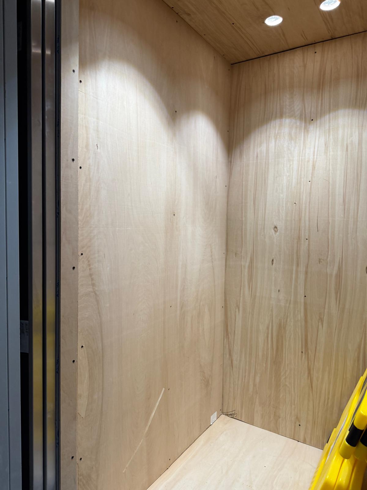 Images showing temporary non-OEM lift area protection installed on live sites during refurbishment works.